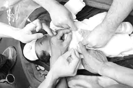 9點(diǎn)35分,記者再次回到岷江大壩旁的主干道。從映秀方向出來(lái)的老鄉(xiāng)逐漸增多。在一座橋旁,從湖北宜興遠(yuǎn)道而來(lái)的李先生靠著祖?zhèn)鞯乃幏胶褪炙,為受傷的人進(jìn)行及時(shí)治療。