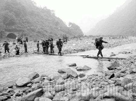 “我們在這里等候團(tuán)長和戰(zhàn)友們回來,他率領(lǐng)部隊正引領(lǐng)數(shù)百災(zāi)民從高山密林中向漢旺轉(zhuǎn)移!鼻叭19時,有著“烏蒙鐵軍”之稱的解放軍某部團(tuán)政委曾祥明站在亂石嶙峋的綿陽河上游河谷中,十分焦急地告訴記者,他們已與團(tuán)長周宏許所率領(lǐng)的數(shù)百官兵失去聯(lián)系10多個小時了。