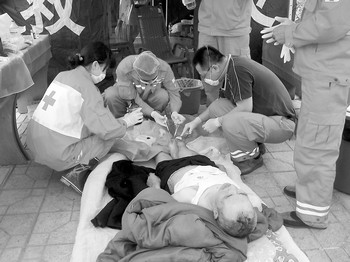 昨日,(四川省)彭州市人民醫(yī)院的重傷員手術(shù)基本完成,湖南醫(yī)療隊分批下到鄉(xiāng)鎮(zhèn),深入災(zāi)區(qū)最前線進(jìn)行救治工作。來自長沙市三醫(yī)院的任朝暉等醫(yī)務(wù)人員,驅(qū)車數(shù)百公里,步行3小時,趕到位于白鹿鎮(zhèn)的3個災(zāi)民點,為400余名災(zāi)民進(jìn)行救治、防病。