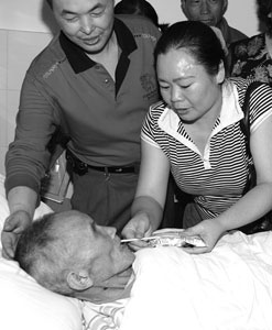 送到醫(yī)院后,老人已陷入昏迷,十多名醫(yī)護(hù)人員立即將老人推進(jìn)病房急救。3名護(hù)士更是守在病床旁連續(xù)呼喊“爺爺,爺爺!”,以對(duì)其模糊的意識(shí)進(jìn)行刺激。用藥2小時(shí)后,老人奇跡般蘇醒過來。不料老人卻對(duì)著醫(yī)護(hù)人員大聲呼喊“我沒有病,我要離開,你們滾!”張貴清趕緊上前握住爺爺?shù)氖,“爺爺,我在這里呢?”見到孫子在,老人才平靜下來。“爺爺患有老年癡呆,他只認(rèn)得到我,所以見到醫(yī)護(hù)人員才會(huì)破口大罵。我感到很不好意思,熱情的重慶醫(yī)護(hù)人員受委屈了!”昨天,張貴清面對(duì)醫(yī)護(hù)人員深深鞠躬以表謝意和歉意。(記者 陳宇)