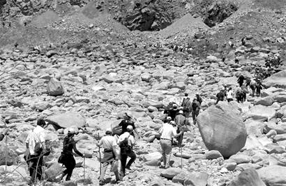 導(dǎo)游和師傅一前一后,護(hù)送著游客徒步往都江堰方向進(jìn)發(fā)。在前行大約5公里后,公路路面已被滑落的山體及大量的石塊完全中斷。游客們只能手腳并用地翻過路障。其中很多老年人根本沒有辦法翻越兩米多高的石堆,于是師傅在后邊推、導(dǎo)游在上邊拉,總算通過了這段障礙。