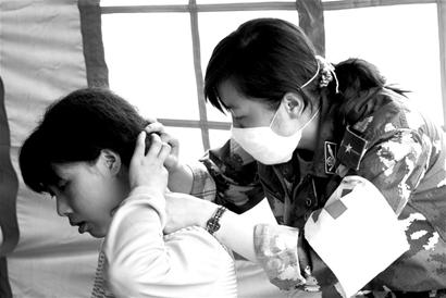 來到前線,尹萍除了救治災(zāi)民外,還要負(fù)責(zé)給尸體消毒。只要挖出的尸體一露出頭或腳,尹萍就會第一個沖上去給尸體消毒,再由戰(zhàn)士抬出來。由于許多戰(zhàn)士都是第一次接觸尸體,多少有點(diǎn)害怕,抬一具尸體就要換個口罩。尹萍總會上前安慰:“尸體沒有腐爛就沒有毒,大家不要怕。”