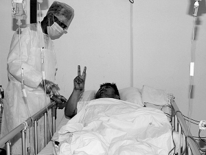 昨日清晨7點(diǎn),經(jīng)過手術(shù)后的短時(shí)間恢復(fù),護(hù)士為馬元江送來了他獲救后的第一餐稀飯,護(hù)士小心翼翼地將50毫升的粥慢慢地喂他喝下。到了中午12點(diǎn)和下午3點(diǎn),又分別喂他喝下了各50毫升的營(yíng)養(yǎng)液。昨日下午6點(diǎn),馬元江看到醫(yī)生和記者在隔離區(qū)探望時(shí),忽然做出了一個(gè)勝利的手勢(shì),讓在場(chǎng)的人非常感動(dòng)。