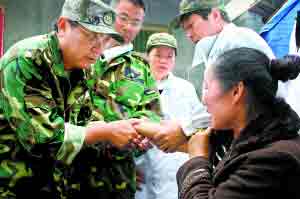 “醫(yī)生,我這只腳前幾天骨折了,地震的時(shí)候跑得太急又受了傷,你看能不能治一下。”一位村民擠上來(lái)提出要求。人群中,一位醫(yī)生立即蹲下身去,仔細(xì)地察看起傷者沾滿泥濘的腳踝。村民們或許沒(méi)有注意到,眼前這位醫(yī)生的迷彩服上竟然戴著少將軍銜,或許他們更沒(méi)有料到,這位少將便是306醫(yī)院的院長(zhǎng),著名骨科專家鄒德威。鄒院長(zhǎng)仔細(xì)捏了捏傷處,又詳細(xì)詢問(wèn)了病情,微笑著告訴那位村民:“最近這幾天不要總下地走路,多注意休養(yǎng),很快就會(huì)好起來(lái)的!