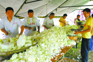 土坡上挖幾個(gè)大坑,直徑一米多的大鐵鍋架起來,半鍋水沸騰,直徑一米的大圓木桶立在鍋中!盎鹜c(diǎn),再旺點(diǎn)。”一個(gè)小伙兒往坑內(nèi)塞木板,他五米外的木板堆,近一人高。旁邊大桶的米飯率先出爐,廚師劉福彬用臉盆當(dāng)飯勺。煮飯區(qū)旁邊,堆起的圓白菜面積像籃球場(chǎng)那么大。幾位女廚用大刀切菜。