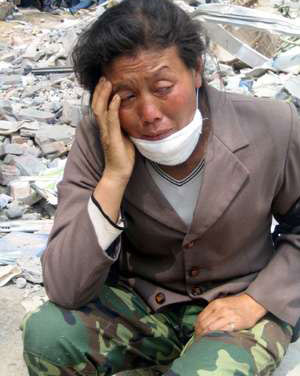 那邊是盼望著孩子歸來(lái)的母親,一名坐在書堆上的婦人已經(jīng)泣不成聲。她說(shuō),大地震令她死了兩個(gè)孩子,其中一個(gè)剛滿17歲,都還沒有找到,等待消息的日子,她都吃不下東西。她一面頻頻回頭看著遠(yuǎn)遠(yuǎn)的挖掘現(xiàn)場(chǎng),一面說(shuō),如果挖出了她的孩子,她無(wú)論怎樣都會(huì)認(rèn)得出來(lái),因?yàn)楹⒆宇i項(xiàng)上還戴著一塊玉,是龍的形狀。說(shuō)罷,她又再滿懷希望地沖向抬著擔(dān)架的救援人員……。