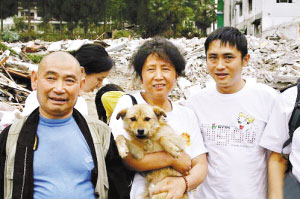 “兩只狗在巨石邊!鄙城迦蛻(zhàn)友一點點搬開巨石,將老人救出。老人艱難地說,她叫王友瓊。地震當時,她和其他香客從寺廟廢墟中爬出來,在翻過幾座山后,被泥石流包圍。與她同行的人都遇難了,而她卻依靠雨水和從“農(nóng)家樂”里逃出的兩條狗,保住了性命,因為小狗總是舔她的唇,給了她延續(xù)生命的水分。