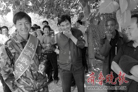 村頭的大樹上掛著“歡迎抗震救災(zāi)英雄回家”的紅色條幅,全村的父老鄉(xiāng)親都涌了出來,站在小路邊夾道歡迎,十個(gè)人一下車,鞭炮聲便響個(gè)不停。鄉(xiāng)親們摸摸這個(gè)、瞧瞧那個(gè),想看看平日里見慣了的這幾個(gè)人是不是突然長(zhǎng)了三頭六臂。
