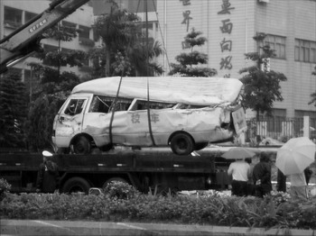 “我看見(jiàn)墻角冒出渾水,感覺(jué)圍墻就要倒了。馬上讓司機(jī)往前開(kāi),但車(chē)開(kāi)動(dòng)不過(guò)10多秒,圍墻就真的倒了!弊蛱煸缟7時(shí)30分,虎門(mén)三中校門(mén)左側(cè)的一段圍墻在大雨中倒塌,重慶人彭必輝所乘坐的面包車(chē)也被磚石砸中。虎門(mén)鎮(zhèn)有關(guān)部門(mén)稱(chēng),圍墻倒塌事故造成兩人死亡,13人受傷,兩名死者均為該校學(xué)生。