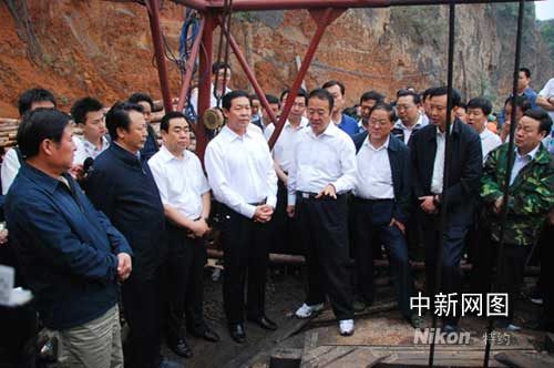 6月14日10時(shí),國(guó)家安監(jiān)總局局長(zhǎng)王君、國(guó)家煤礦安全監(jiān)察局局長(zhǎng)趙鐵錘(后者)、山西省省委書(shū)記、省人大常委會(huì)主任張寶順(前者)趕到事故現(xiàn)場(chǎng),到井口差察看,并詳細(xì)詢問(wèn)搶救進(jìn)展情況。作者:張建益