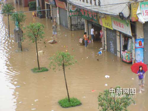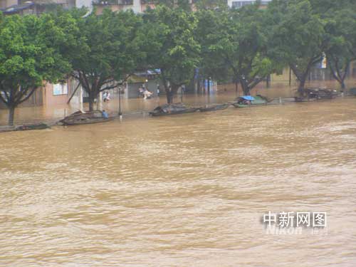 從今晨開始,流經(jīng)韶關(guān)市區(qū)的湞江和武水(均為廣東北江支流)均已漫過河堤,淹浸部分街市。記者看到,位于市區(qū)風(fēng)度路步行街南端的中山公園已是一片汪洋,園前西路亦成澤國,有人以小船代步,或用小艇裝運雜物。而在火車站附近的某大型超市,記者則看到購買大米、蔬菜、速食面、瓶裝水等物品的顧客明顯比往日多,但商場內(nèi)這些物品貨源充足,貨架不斷空架,又不斷補足充滿。