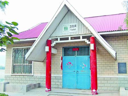 這個廁所位于澗河北岸河堤路中段,建得相當考究,整個建筑由幾根柱子支撐著懸空于澗河邊,墻壁全部由高檔瓷磚砌就,廁所里安裝有空調。在廁所門口上方有兩個醒目的大字:“公廁”。門口一側的墻上還刻有一方中英文對照的簡介:“旅游公廁,建成于2002年9月25日,面積104平方米,豪華、舒適,標準為三星級。”