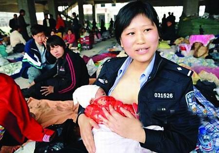地震發(fā)生后,被轉(zhuǎn)移來的嬰兒除了可以喝一點(diǎn)水和稀飯外,沒有其他東西可吃!按笕诉可以餓、還可以忍,而這些小嬰兒卻不能餓、不能忍!作為母親,我覺得這些孩子太可憐了。正好我還在哺乳期,就讓我來給他們喂奶吧!”在受災(zāi)群眾安置點(diǎn)協(xié)助工作的29歲民警蔣曉娟提出:我去給這些嬰兒哺乳!