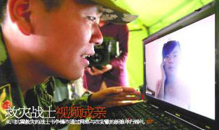 “看見啦!hello,媳婦兒!”昨日16:18,都江堰學(xué)府路一處板房搭建地的綠色帳篷內(nèi),27歲的新郎倌終于看見了電腦屏幕上穿著潔白婚紗的新娘。整個(gè)婚禮僅僅持續(xù)了9分鐘,這是一場(chǎng)簡(jiǎn)單得不能再簡(jiǎn)單的婚禮,卻跨越了千里!新郎倌因?yàn)殡S部隊(duì)入川參加抗震救災(zāi),無法如期趕回安徽家中與新娘舉行婚禮,便通過這種方式,完成了對(duì)新娘的承諾。