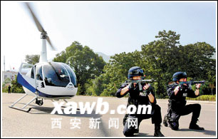 在昨日舉行的西安2008“城市聯(lián)動”反恐怖演練中,西安警方的首架編號為“61011”的警用直升機(jī),第一次正式亮相,升空執(zhí)行警務(wù)。這架警用直升機(jī)的投用,也是我市警力護(hù)航奧運(yùn)安保的重要措施。