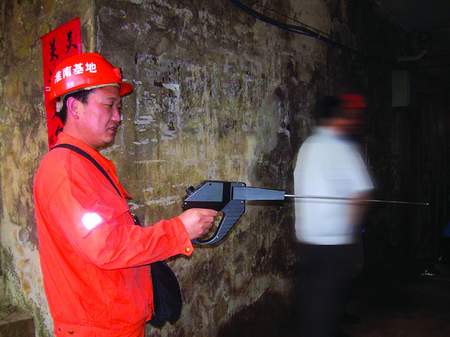 救援人員拿著生命探測儀進(jìn)入坑口