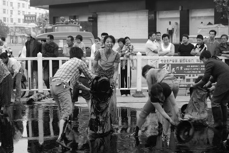 吊車作業(yè)的過程中,就有部分人準(zhǔn)備好簸箕、臉盆等工具,要搶泄漏在地面上的原油。7時(shí)許,見仍沒有專門的清理人員前來清理路面上的原油,部分人開始哄搶原油,他們先是五六個(gè)人一組站成一圈,圈定自己的地盤,接著用衣服、簸箕、臉盆等工具收集路面上的原油,然后迅速裝入編織袋內(nèi)。