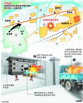 據(jù)張家界警方初步查明,該辦事處彭家巷社區(qū)七組居民田開友,因?qū)ψ约疫`法建筑被有關(guān)部門依法拆除產(chǎn)生不滿,于昨日上午駕駛一輛裝有兩個(gè)已點(diǎn)燃的液化氣瓶的農(nóng)用三輪車沖進(jìn)辦事處院內(nèi),在辦公樓前發(fā)生爆炸,爆炸產(chǎn)生的沖擊波造成12名干部和群眾受傷。田開友在案發(fā)5分鐘后被警方抓獲。據(jù)了解,西溪坪街道位于張家界市區(qū)東部,東臨慈利縣金巖,南連大坪鎮(zhèn),西接官黎坪街道辦事處,北有澧水河與陽湖坪鎮(zhèn)相望,是張家界市新興的旅游工業(yè)開發(fā)區(qū),人口3.53萬人,轄23個(gè)建制村、3個(gè)居委會(huì)。