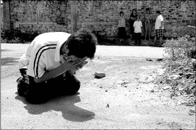 王彪在父親死去的地方下跪痛哭。 記者 張沫 攝