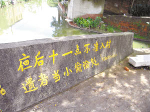 記者隨即撥通了元昌村民小組所屬的順德區(qū)杏壇鎮(zhèn)路涌村委會(huì)書記周肖杰的電話,他委托一位不愿意透露姓名的村干部接受了記者的采訪,稱標(biāo)語是近日貼出的,”是我們小組20多戶人家開會(huì)集體制定的這條村規(guī)民約,我們也是實(shí)在沒有辦法,因?yàn)榇謇锩娼?jīng)常發(fā)生被盜事件,村民損失很大,所以成立了防偷小組,貼出這樣的標(biāo)語,也是為了晚上巡邏時(shí)方便些。也希望阻嚇那些犯罪分子,不要隨便進(jìn)我們村。”