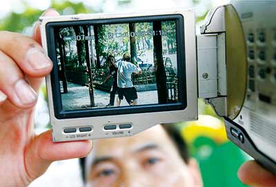 “開始我還以為他們是朋友之間在開玩笑。”章先生介紹說,在嘈雜的人聲中那名白衣男子后來抓住黑衣男子的一只手,并伸手到他的兩個褲子口袋里掏出兩瓶洗發(fā)液。隨后,章先生看到黑衣男子甩手給了白衣男子一耳光!安缓,他們動真格了。”章先生稱,他立即掏出隨身攜帶的DV機開始錄起現(xiàn)場來。