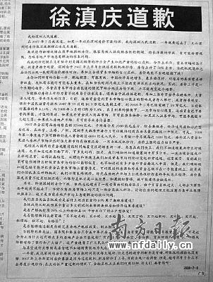 徐滇慶刊登在《南方都市報》上的道歉廣告。