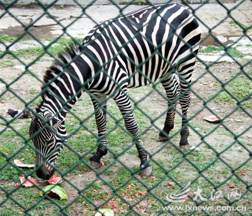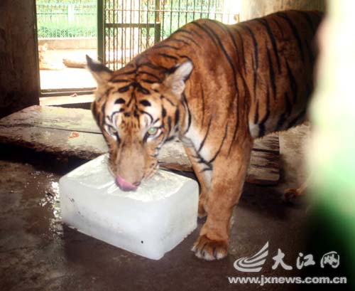16日,記者在南昌市動(dòng)物園看到,老虎正抱著大冰塊睡著大覺!疤鞖馓珶,我們每天都要消耗近600公斤冰塊為5只老虎降溫。3只大象每餐也要吃掉約75公斤西瓜!憋曫B(yǎng)員告訴記者。記者看到,河馬喜歡泡在水池里,熊貓則躲在空調(diào)房里愜意地打著盹,大象、斑馬忙著啃西瓜。