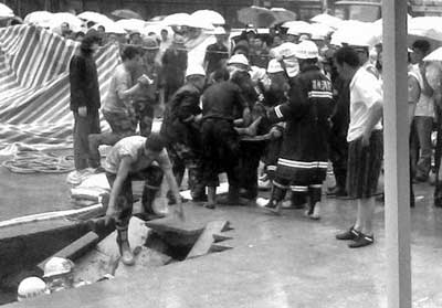 昨天上午9時(shí)50分,鄭州市區(qū)下著雨。郭先生沿敦睦路人行道向北走著,前面是一中年男子和一年輕女子!奥犚娹Z隆一聲響,我前面走的倆人沒影兒了,倆人掉進(jìn)大坑了!倍啬缆分苓呌卸嗉掖笮头b商場,平日行人如織。