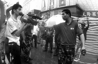 10時(shí)15分,來了20余名穿紅上衣、衣服上標(biāo)有“大同路人防工程”字樣的年輕男子,阻撓記者采訪。拿手機(jī)拍照的群眾也遭到威脅。河南日報(bào)記者在拍照時(shí),六七名紅衣男子上前,揪住記者上衣領(lǐng)口,反扭其雙手,往機(jī)動車道上推搡,記者的上衣被撕爛。市民紛紛指責(zé)這些紅衣男子,不去救人,反而扭打記者。