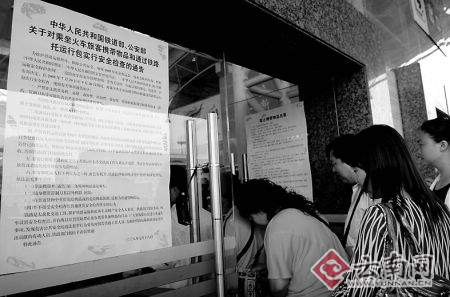 奧運(yùn)會(huì)即將召開之際,昆明發(fā)生的公交車爆炸案,繃緊了公共交通工具的安全神經(jīng)。昨日,民警和保安在昆明火車站四處張貼了一份通告,按照所張貼的鐵道部和公安部聯(lián)合發(fā)出的最新通告,從現(xiàn)在至9月20日,對(duì)旅客乘坐火車攜帶物品和通過鐵路托運(yùn)行包必須實(shí)行安全檢查,菜刀、大型水果刀、剪刀、斧子、錘子等利器、鈍器一律放入行李中托運(yùn)。通告指出,對(duì)拒絕接受安全檢查或堅(jiān)持?jǐn)y帶違禁物品的旅客,鐵路部門可禁止其進(jìn)站乘車。