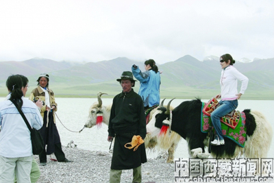 進(jìn)藏游客騎著牦牛在“天湖”納木錯(cuò)邊留影。