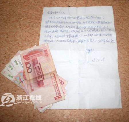 “今天早上查房的時候,我們發(fā)現(xiàn)曉濤的家長一個也不在。先還以為他爸爸上班去了,但后來在他床頭發(fā)現(xiàn)了這樣一個信封。”省兒保燒傷整形科的值班護士遞給記者一個信封。拆開一看,里面有一封曉濤父母的手寫書信和四百元人民幣。在信中,他們稱為曉濤治病已花去4萬余元,其中自己的積蓄有8000元(還有三萬余元來自捐款),目前已經(jīng)傾家蕩產(chǎn)、無能為力,故希望社會上有好心人能收養(yǎng)自己的兒子。