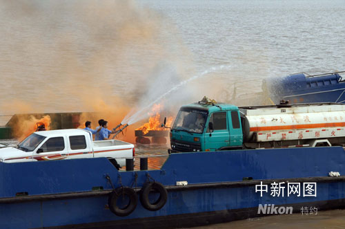 在演習模擬現(xiàn)場,“海太七號” 在正常航行途中,甲板水手長突然發(fā)現(xiàn)一車上人員提著一只裝有燃料油的塑料桶下車,飛快走向一輛裝有甲醇危險品的車輛,將手中的汽油灑向甲醇車,掏出打火機、點燃大火。他跳上裝有甲醇的槽罐車開啟閥門,讓甲醇泄漏,企圖制造更大的恐怖事件。渡船船員迅速與恐怖分子展開搏斗,組織滅火,并將險情向海門市政府和南通海事局交管中心報告。