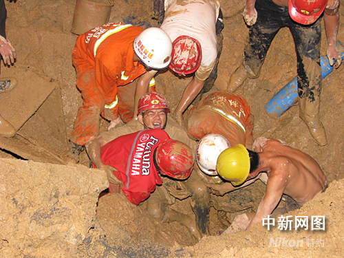 17時(shí)06分,一輛大型鉤機(jī)到達(dá)現(xiàn)場(chǎng),將深坑下的大塊水泥板鉤出,為救援取得空間。18時(shí)35分,現(xiàn)場(chǎng)救援人員發(fā)現(xiàn)被困男子出現(xiàn)瞌睡現(xiàn)象,醫(yī)護(hù)人員立即取來葡萄糖,由于救援空間限制無法給男子打點(diǎn)滴,醫(yī)護(hù)人員只好讓男子喝下葡萄糖,并為男子接上氧氣,且讓一名工友陪同講話,防止男子昏睡。19時(shí)10分,經(jīng)過現(xiàn)場(chǎng)救援人員的努力,一直壓在男子身上的斗車被吊離,男子右腿被成功救出。但是由于男子是半跪姿勢(shì),背部大石塊妨礙了左腿救援,無法將左腿拿出,消防隊(duì)員和其他工人只好采取手刨的方式,一點(diǎn)一點(diǎn)將男子左腿膝蓋前泥土挖出。經(jīng)過3個(gè)多小時(shí)的營(yíng)救,19時(shí)50分,男子被成功救出,經(jīng)醫(yī)生初步診斷,男子雙腿無大礙。