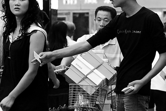 這些中年男子見到單個女性行人,都會“熱情”地往她們手里塞卡片。只要嘗試著接受了一張卡片,其他派卡人便會一擁而上,隨后就硬往你身上“見縫插針”。如果是男性行人表示不要,這些人便不會再糾纏。