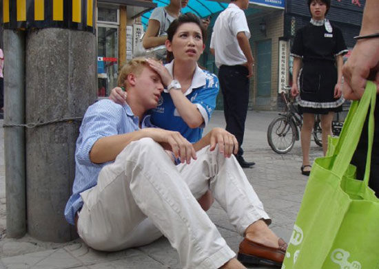商憶沙說(shuō),“大概是奧運(yùn)會(huì)正式開幕前兩天,下午三四點(diǎn),我穿著志愿者的衣服在三元橋附近路過(guò),正準(zhǔn)備去參加奧林匹克青年?duì)I晚會(huì)的一個(gè)表演,當(dāng)時(shí)那位暈倒的外國(guó)朋友身邊已經(jīng)圍了一點(diǎn)人,但是人們也不敢碰他,不知道是因?yàn)槭裁丛驎灥,也不知道他?huì)不會(huì)講中文。 ”在志愿者培訓(xùn)時(shí)接受過(guò)英語(yǔ)口語(yǔ)和簡(jiǎn)單急救知識(shí)訓(xùn)練的商憶沙此時(shí)便走上前去,“我當(dāng)時(shí)也很緊張,有點(diǎn)不知所措,不過(guò)除了志愿者的培訓(xùn)外,我家里有人在做醫(yī)藥方面的工作,所以從小就學(xué)習(xí)過(guò)簡(jiǎn)單的急救方法,于是幫他按人中和太陽(yáng)穴,其實(shí)手一直在抖。我用英文問他感覺怎么樣時(shí),他用中文回答‘我很好’,這時(shí)大家才知道他會(huì)講中文!