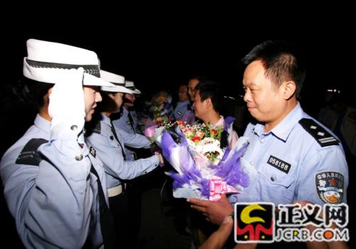 向凱旋歸來的辦案民警獻(xiàn)花。