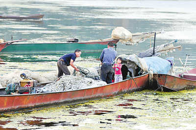 位于陽(yáng)宗海邊的昆明市宜良縣湯池鎮(zhèn)施家嘴村,當(dāng)?shù)卮迕竦纳钆c陽(yáng)宗海息息相關(guān)。記者看到,這里隨處可見(jiàn)的是昆明、玉溪兩市政府對(duì)陽(yáng)宗海實(shí)施“三禁”的通告:禁止飲用陽(yáng)宗海水;禁止在陽(yáng)宗海游泳;禁止捕撈陽(yáng)宗海的水生產(chǎn)品。通告的簽發(fā)日期是9月17日。