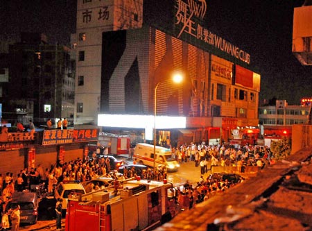 凌晨1時,記者趕到事發(fā)現(xiàn)場,舞王俱樂部占地面積千余平方米,被一片民房包圍,外墻看不出明顯的火災痕跡。廣告招牌依然亮著。記者進入三樓俱樂部大廳看到,地面上散落著許多女式涼鞋。俱樂部三四樓一片漆黑,玻璃窗全被打碎,窗口處被濃煙熏得一片漆黑,空氣中還凝聚著一股強烈的焦味。上完樓梯后有一條大約10米長的狹窄過道,在過道的地上全是逃生人員散落的鞋子。大廳中央是個表演舞臺,大廳里擺放著百余張桌子,周圍有十多間包廂。大廳里不少桌子、椅子被掀翻。