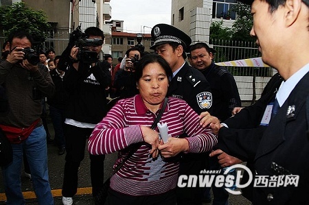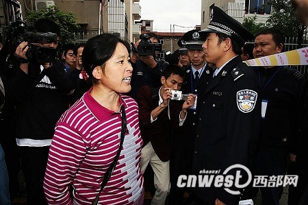 中午10:30 在雨中等待了2個(gè)多小時(shí)的羅大翠接到一個(gè)電話,在通話的過(guò)程中,羅大翠的情緒變得更加激動(dòng)起來(lái),隨即和執(zhí)勤民警交涉起來(lái),試圖越過(guò)警戒線,闖進(jìn)法庭。但是兩次努力都被執(zhí)勤民警婉拒。截至27日上午11時(shí)30分,周正龍案已經(jīng)開(kāi)庭審理了3個(gè)小時(shí),周正龍妻子羅大翠和兒子仍未被允許進(jìn)入法庭。(記者 錢海峰 陳武)