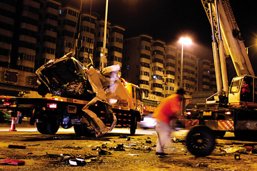 今天凌晨1時30分左右,廣州黃埔大道華僑醫(yī)院對出位置發(fā)生重大車禍,一輛面包車撞上一輛在修的槽罐車后,再撞水泥攪拌車,記者在現(xiàn)場看到四具尸體。警方今早確認(rèn)事故造成四人死亡。