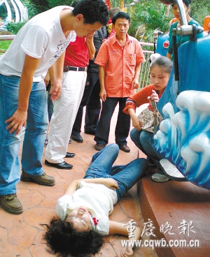 “有人墜地了!”周圍響起叫喊聲?ㄔ诒kU(xiǎn)杠和座位之間,身子懸在半空的凌澤坤這才發(fā)現(xiàn),李鳳躺在游藝機(jī)旁邊的地上。游藝機(jī)經(jīng)過一圈減速后,很快停下來。凌澤坤趕到李鳳身邊,只聽見李鳳說聲“頭痛”就昏過去。動物園管理人員和傷者家屬一起把傷者送到九龍坡區(qū)第一人民醫(yī)院接受治療。