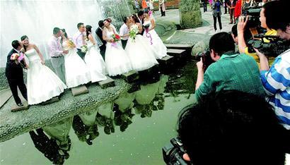 記者在現(xiàn)場(chǎng)看到,合江亭的眾多新人,搞錯(cuò)對(duì)象的畢竟還是少數(shù),但不小心踩了別人的婚紗,親戚跟錯(cuò)了隊(duì)伍之類的事情倒是經(jīng)常容易見(jiàn)到!叭绻麚Q種心情,倒是為喜慶添點(diǎn)氛圍吧!睂(duì)此,王海安慰自己。