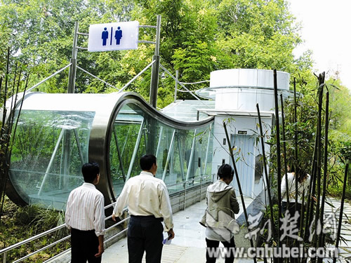 綠樹、翠竹掩映之間,遠(yuǎn)看好像是一座玻璃和不銹鋼結(jié)構(gòu)的涼亭,走近才發(fā)現(xiàn),沿臺階或電梯往下,竟是一座漂亮的免費公廁。昨日,位于漢口解放公園大門南側(cè)的江城首座地下公廁投入試運行。
