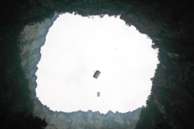他們在距離坑底大約200多米處,“砰”地打開了傘包,同時,雙手還放出絢麗的煙火。美麗的火花在山谷中綻放,遍布在山上的觀眾歡呼起來。傘打開后,在山谷中飛旋了一圈,然后擦過樹枝,緩緩落在坑底搭建的著陸臺上。此后的國內(nèi)外極限運動員們在天坑絕壁和鋼繩上大展絕技,完成了翻滾、飛燕、前后空翻、雙人跳、三人跳及多人組合技巧表演等一系列扣人心弦的跳傘動作。
