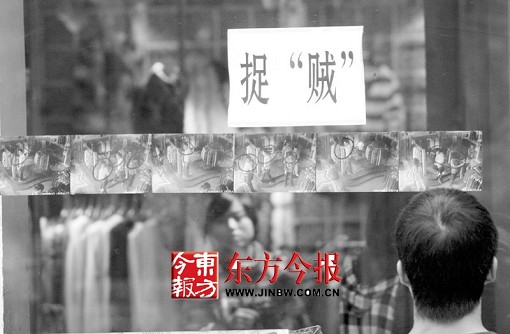 商丘市步行街一家服裝店因衣物被盜,店方從監(jiān)控錄像里截出6幅圖片,沖洗后貼在店鋪櫥窗外,引來很多市民駐足觀看。