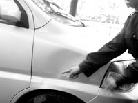 昨日15時(shí)40分,記者來到位于正義路市公安局對面的輔路上,只見一名30來歲的青年男子倚在警車旁邊,大半個(gè)身子倒在地上意識迷湖,民警正在一旁詢問情況。警車的身后停著三輛有城管標(biāo)志的車,其中一輛金杯車的前蓋右側(cè)處有一個(gè)坑,表層的鐵皮明顯凹陷 (見圖),車身上寫著“崇文綜合執(zhí)法”,還有一輛車的車斗上有一輛舊三輪車,城管工作人員稱,該三輪車是被暫扣的非法無照運(yùn)營車輛。