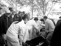 昨日16時(shí)10分,120急救車趕到現(xiàn)場,醫(yī)護(hù)人員用擔(dān)架將該男子抬上救護(hù)車(見圖)。但青年男子的同鄉(xiāng)們拒絕隨同急救車前往同仁醫(yī)院,而是守在原地不讓城管的執(zhí)法車輛離開。經(jīng)民警上前調(diào)解后,他們才離開現(xiàn)場。