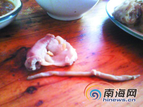 大家吃了一陣后,同桌的一位女士又加了份粉腸。而當(dāng)大家準(zhǔn)備動(dòng)筷進(jìn)吃粉腸時(shí),突然發(fā)現(xiàn)其中一截粉腸兩端竟然露出異物,用筷子夾出來(lái)一看,竟然是條長(zhǎng)約9厘米的寄生蟲(chóng)。大家當(dāng)時(shí)都惡心不已,其中一位女士更是跑到一邊嘔吐不止。