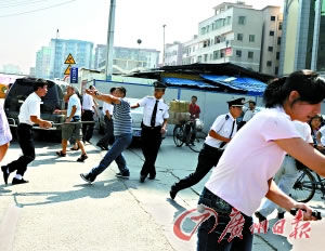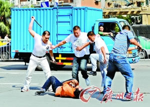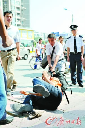 廣州日?qǐng)?bào)10月18日?qǐng)?bào)道 昨天上午10時(shí),廣州市中山大道,四個(gè)壯漢當(dāng)街毆打一名《廣州青年報(bào)》的送報(bào)員,兩名白色衣服的保安自始至終在一邊旁觀。后來(lái),有市民上前勸說(shuō)阻擋,并協(xié)助警察將其中兩名犯罪嫌疑人抓獲。